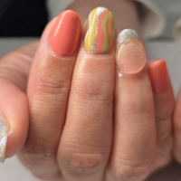優しいカラーを集めて春色ネイルに♪ 剥離してしまった薬指はジェルは塗らずナチュラルネイルのまま♪